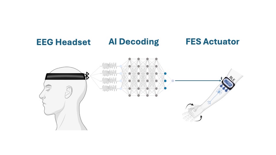 ReFlex uses a wearable headset to record EEG signals, which are processed by a real-time deep learning algorithm to decode motor intent. The decoded intent triggers an FES device to stimulate muscle movement in the intended limb, reinforcing and rebuilding neural pathways in real time.